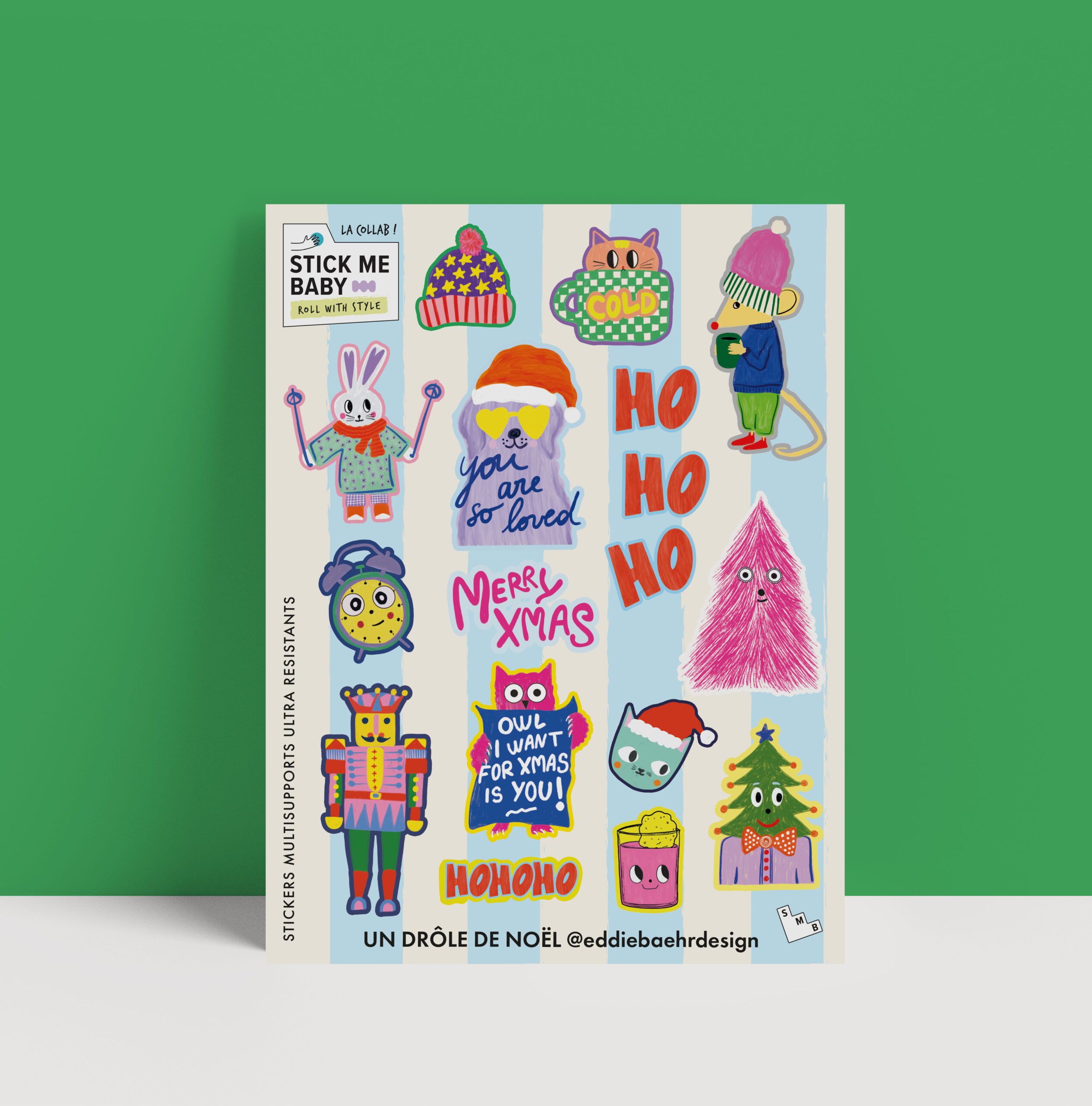 🎄 Plongez dans la magie décalée de “Un drôle de Noël”, la planche de stickers signée SMB X EddieBaehrDesign ! Cette collaboration pétillante réunit l’univers coloré et plein d’humour d’ EddieBaehrDesign avec l’esprit festif de Stick Me Baby. Entre petits animaux malicieux et personnages hauts en couleur, ces autocollants apportent une touche joyeusement farfelue à vos fêtes. Parfaits pour décorer vos objects du quotidien, de votre laptop à votre frigo, ils feront sourire petits et grands tout au long de la saison ! 🦌✨